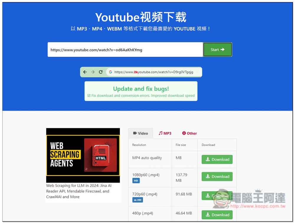 yt2K 一樣可下載 YouTube 影片和 MP3 音樂,除了從網站上操作外,也能直接在 YouTube 網址前面加上 2k,就會自動跳轉到這網站,這還蠻方便的,更改網址就能下載 YouTube 影片。