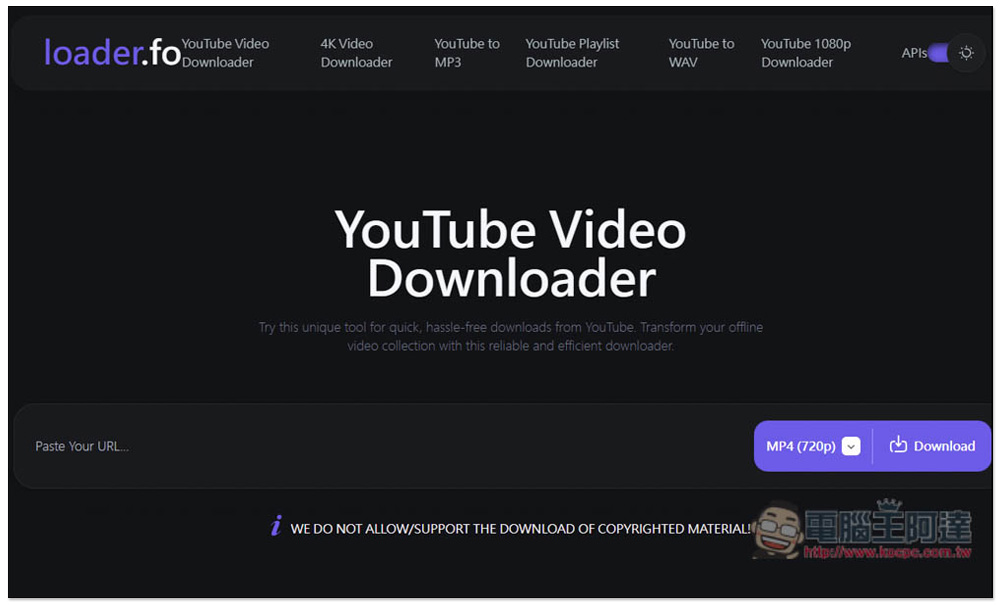 loader.fo 最高可下載 YouTube 4K 解析度影片,格式是 WEBM,想要 MP4 的話需要自行轉檔。2K 以下就能選擇 MP4 格式。