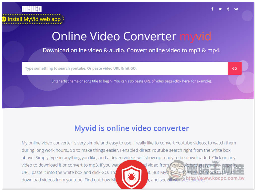 Myvid 的特色在除了能下載 YouTube MP4 影片和 MP3 音樂,還內建搜尋功能,意味著你可以直接在這個網站裡搜尋 YouTube 影片並下載,這還蠻方便的。最高可下載 1080p 畫質。
